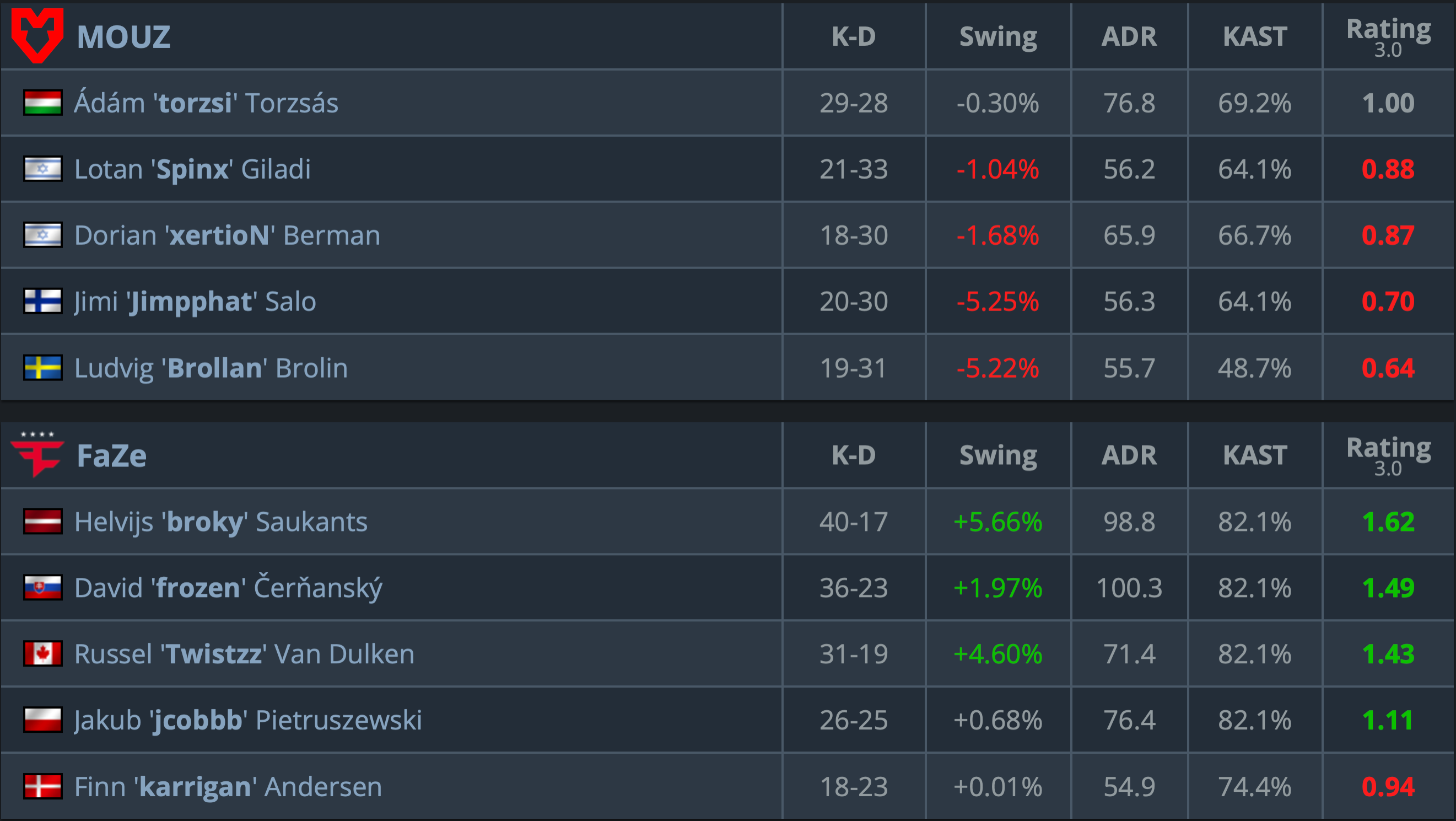 Обе карты прошли под полную диктовку FaZe – на первой MOUZ все-таки сопротивлялись, но на своем пике (Inferno) взяли всего 2 раунда.