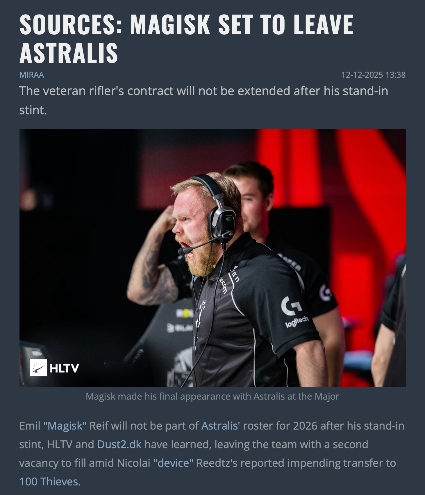Не исключено, что Magisk может присоединиться к набирающим состав 100 THIEVES – тренером CS2-ростера организации уже стал gla1ve, а на позицию снайпера менеджмент выбрал Николая device Ридца.