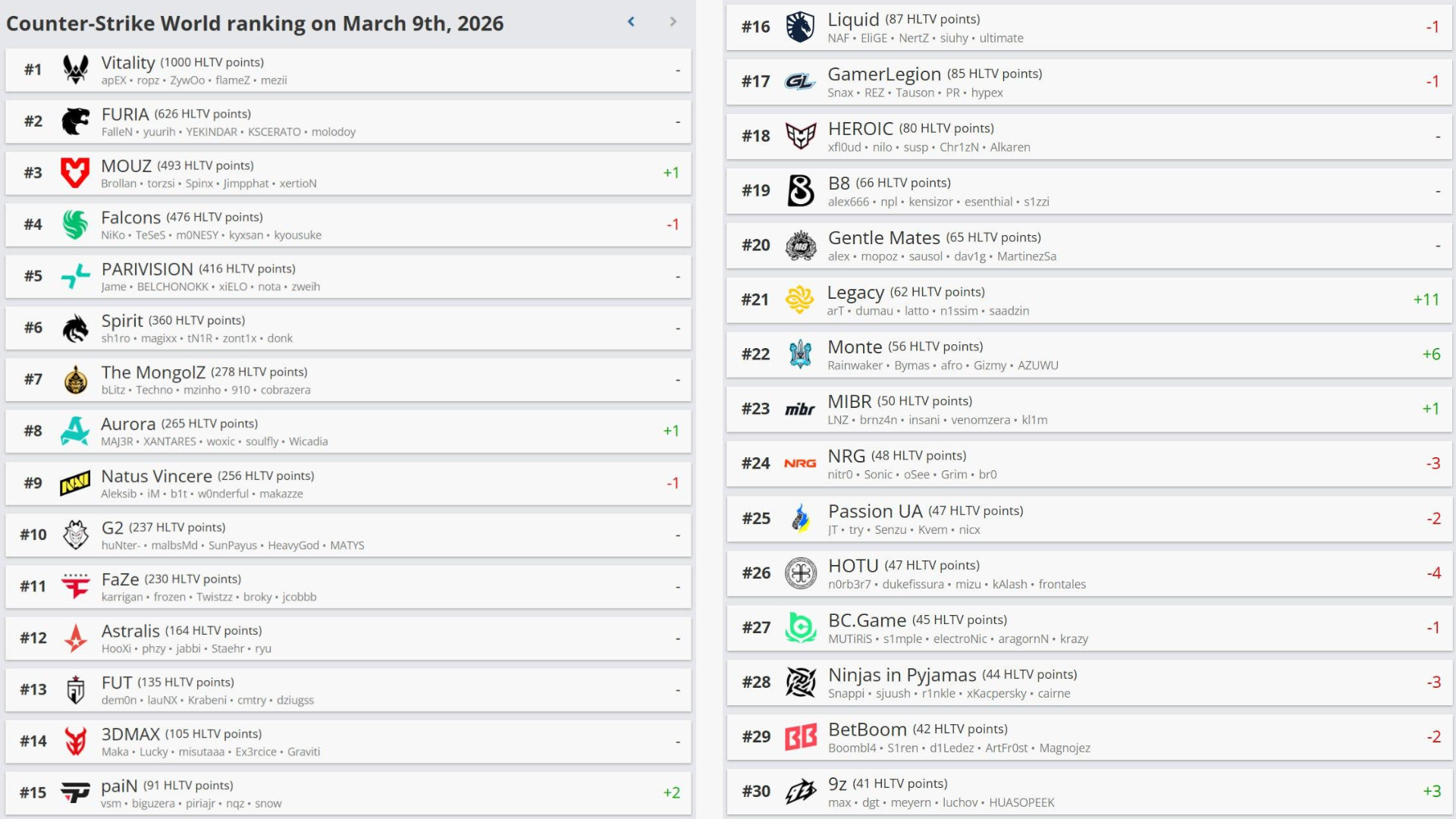 MOUZ выбились в топ-3 лучших команд, а Natus Vincere все ближе к вылету из топ-10 после странных матчей в 2026 году. Также стоит отметить FaZe, которые уже начинают терять шансы на предстоящий IEM Cologne Major 2026 – в этом случае организация впервые пропустит главный турнир сезона в Counter Strike.