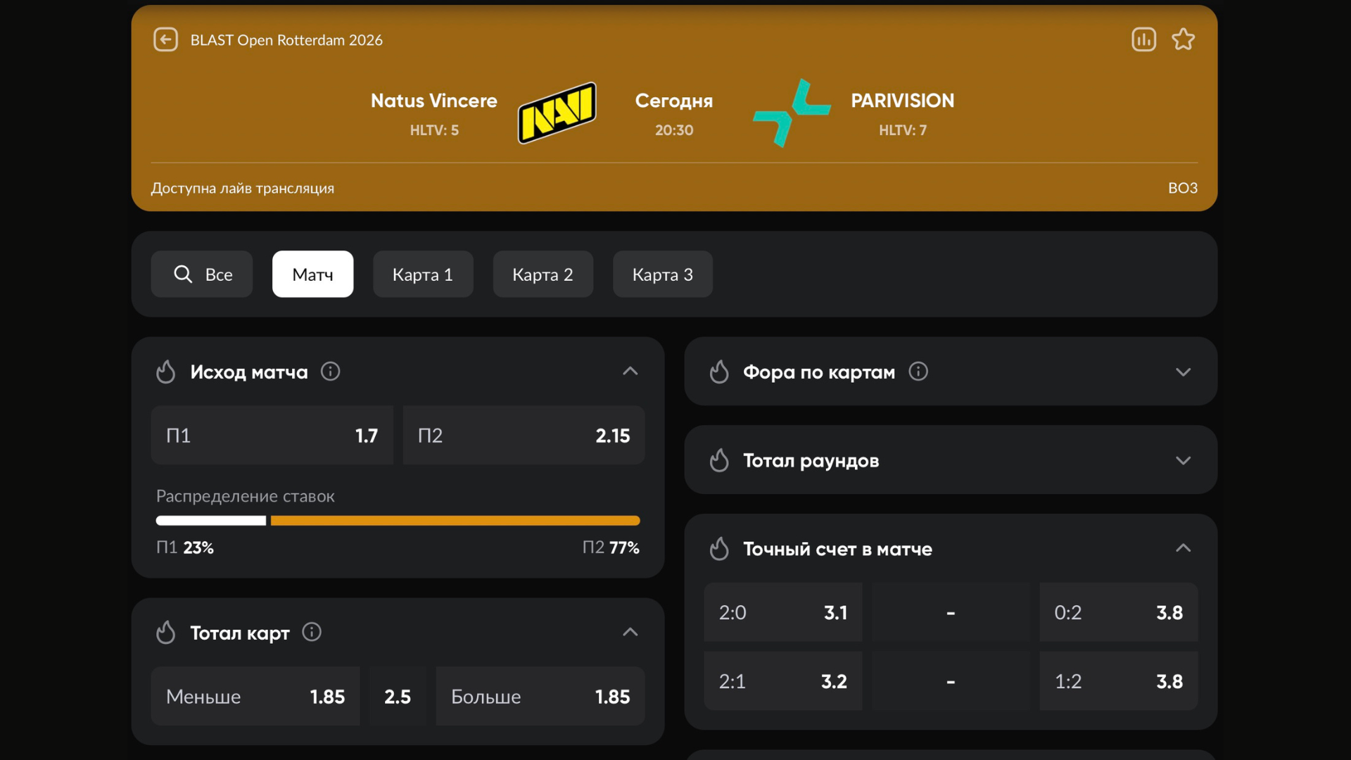Несмотря на то, что PARIVISION смогли выбить сразу двух фаворитов – Spirit и Falcons – букмекерские конторы отдают предпочтение именно NAVI. Европейский состав смог выиграть прошлый крупный турнир EPL 23 и уверенно показывает себя на LAN в Роттердаме.