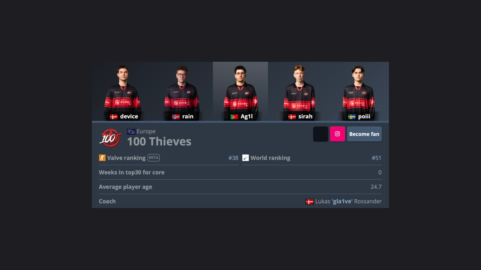 device, rain и gla1ve смогли всего за 1,5 недели войти в топ-50 HLTV и приблизиться к топ-30 рейтинга Valve. VRS-список является основой для инвайтов на крупные турниры и предстоящий Major. Сейчас 100 Thieves имеют 20%-ый шанс на проход в Stage 1 IEM Cologne Major 2026, который стартует в июне.